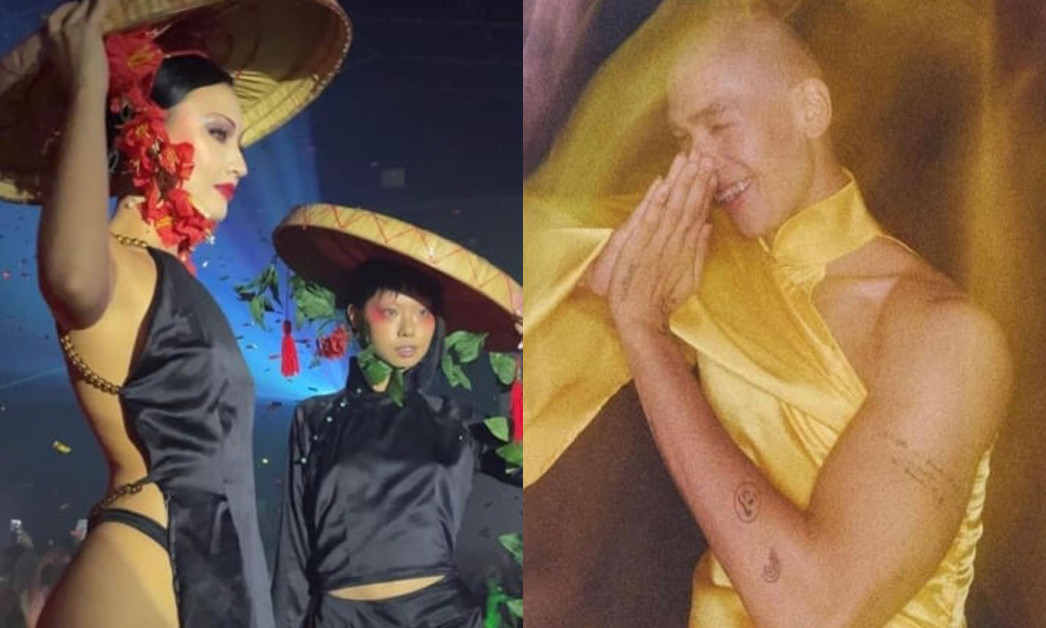 Hình ảnh người mẫu đội nón quai thao, mặc yếm cách tân gây phản cảm trong show diễn thời trang của nhà thiết kế Tường Danh.