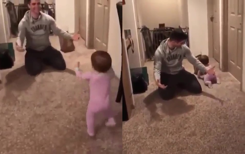 Thấy con gái chập chững dang tay đi ra cửa, ông bố sung sướng dang tay đón, không ngờ bé chạy thẳng ra phía sau đón gói quà.