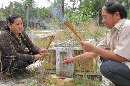 Vợ chồng anh Nghĩa, chị Ta thắp hương cho người xấu số đang nằm dưới đất