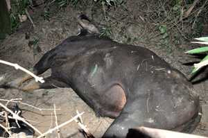 | Chiều 26/5, người dân phát hiện cá thể bò tót chết bất thường trong bụi tre |