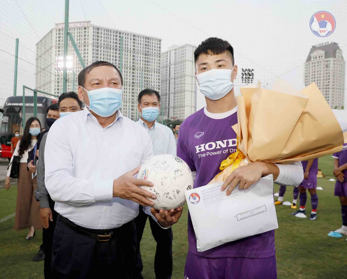 Đáp lại sự động viên của lãnh đạo Bộ, Quế Ngọc Hải và Lương Xuân Trường tặng Bộ trưởng Nguyễn Văn Hùng áo thi đấu tuyển Việt Nam và quả bóng với chữ ký của đầy đủ các thành viên ĐTQG.