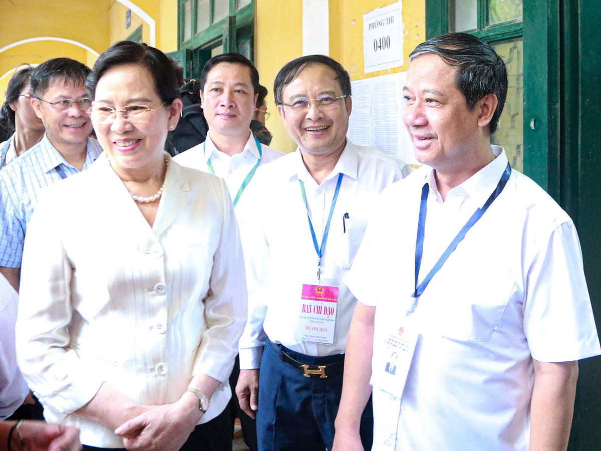 Bộ trưởng GD&ĐT Nguyễn Kim Sơn và Bí thư tỉnh ủy Hà Nam Lê Thị Thủy kiểm tra công tác coi thi tại điểm thi trường THPT B Duy Tiên (Hà Nam)