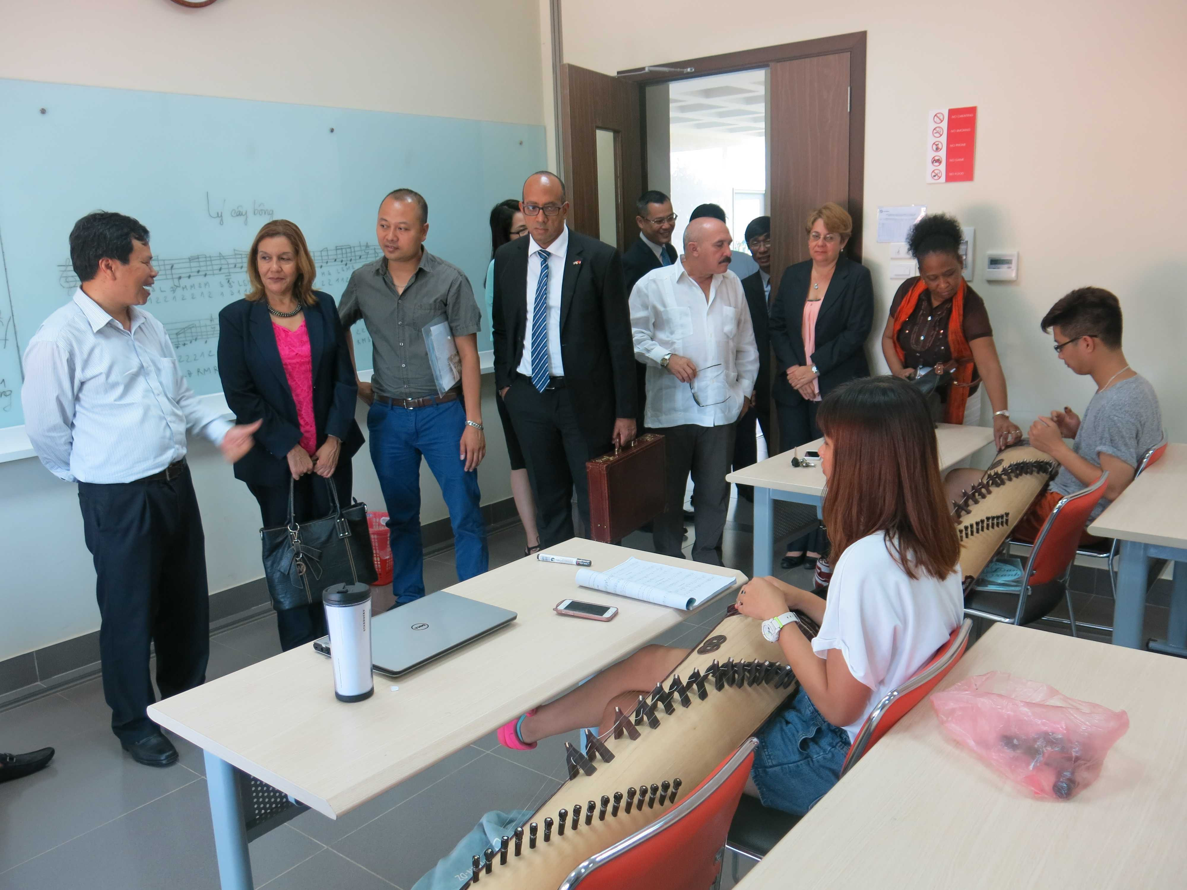 Có mặt tại lớp học nhạc cụ dân tộc, các đại biểu được lắng nghe những chia sẻ về môn học đặc biệt này. Bộ trưởng Elba Rosa Perez Montoya rất thích thú khi được thưởng thức tiết mục “Vào rừng hoa” do chính các bạn sinh viên biểu diễn. Được biết, tại ĐH FPT, sinh viên sẽ được tự chọn một trong 4 nhạc cụ gồm đàn tranh, đàn nhị, đàn nguyệt và sáo để theo học như một môn bắt buộc.