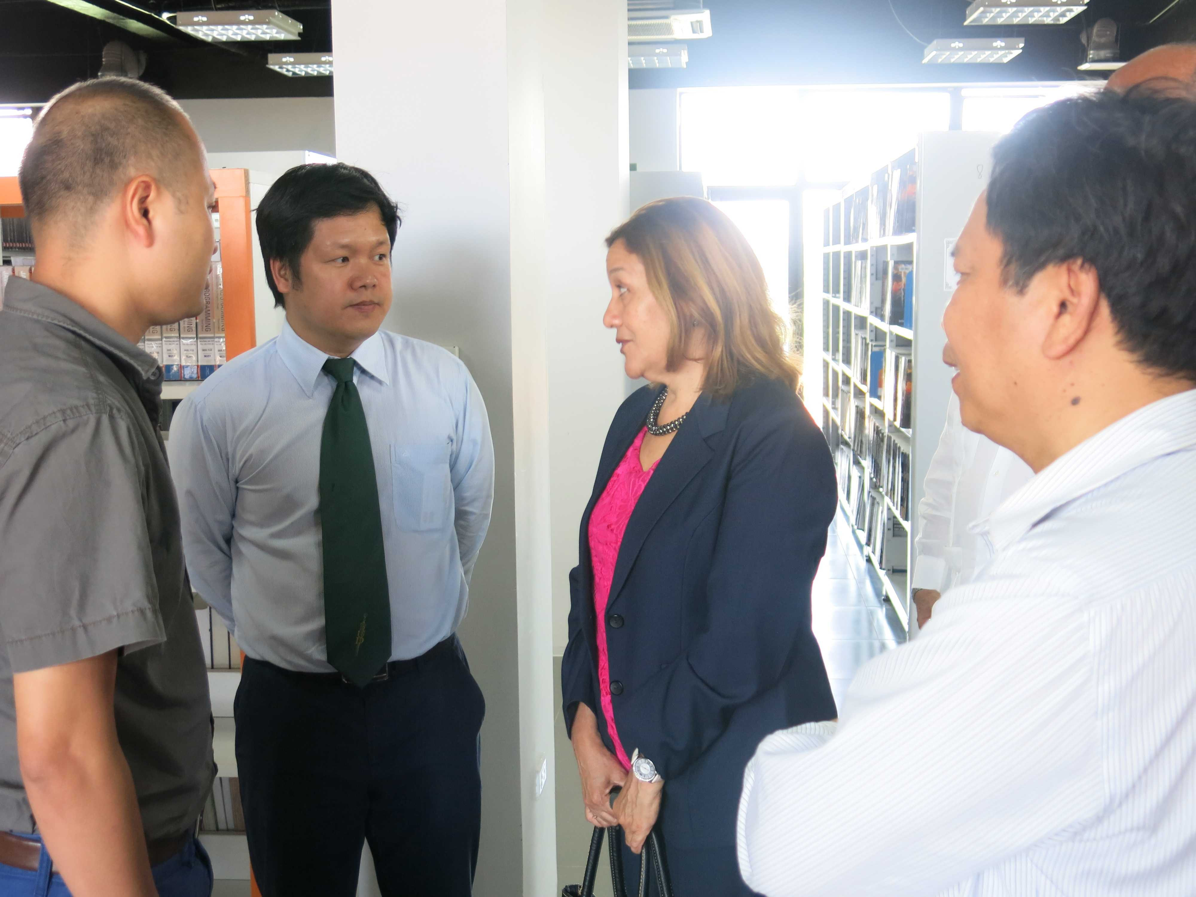 Sau thời gian trao đổi về quy mô và hoạt động đào tạo, đoàn đại biểu đến từ Bộ Khoa học, Công nghệ và Môi trường Cuba đã có thời gian ngắn tham quan cơ sở vật chất tại ĐH FPT, cơ sở Hòa Lạc. Điểm đến đầu tiên là thư viện của trường.