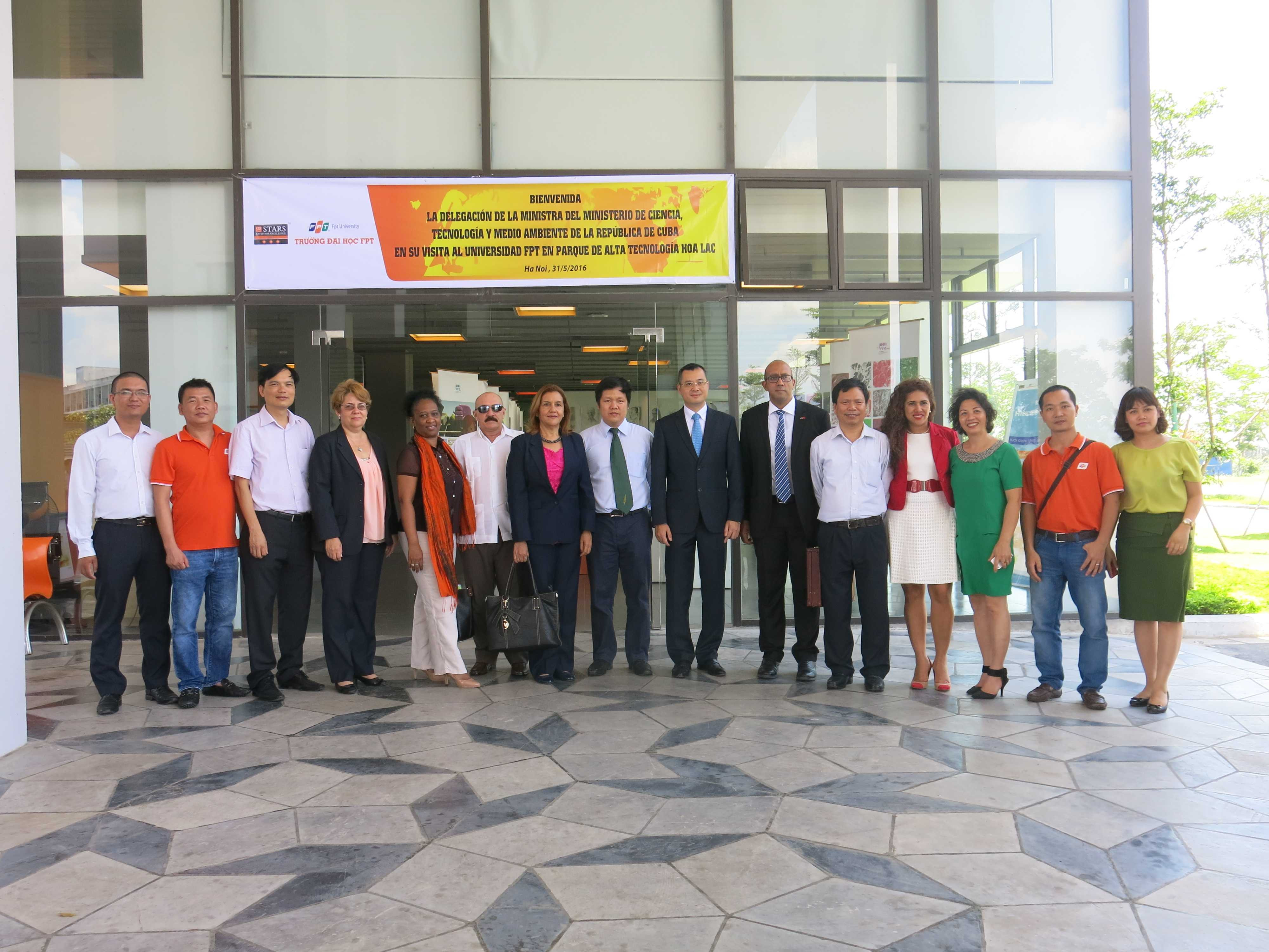 Cùng tham gia chuyến thăm và làm việc tại ĐH FPT còn có các cán bộ đến từ đại sứ quán Cuba tại Việt Nam, tham tán thương mại, Chánh Văn phòng Bộ Khoa học, Công nghệ và Môi trường Cuba.