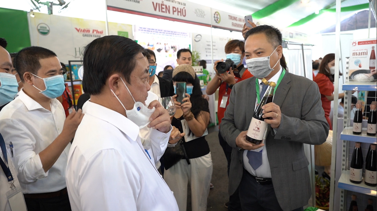 CEO Lê Bá Linh giới thiệu nước mắm Mami cho Bộ trưởng Lê Minh Hoan trước khi nếm thử.