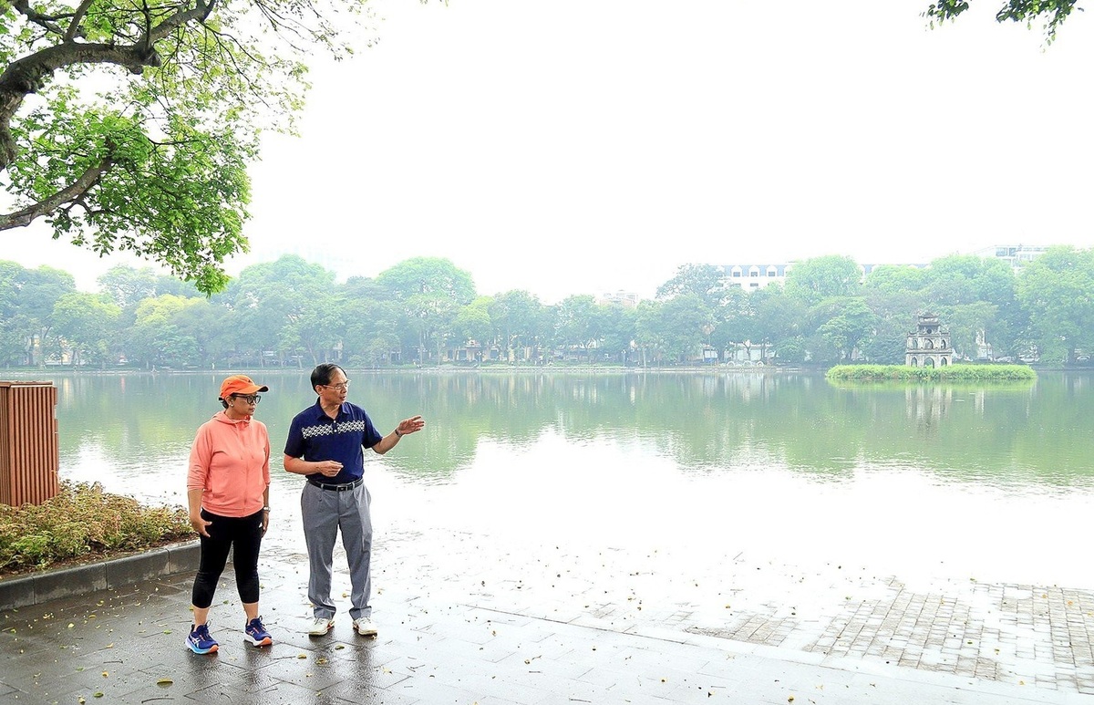 Trong trang phục thể thao thoải mái, hai bộ trưởng sau đó đã cùng đi dạo ngắm Hồ Gươm và các di tích lịch sử của Hà Nội.