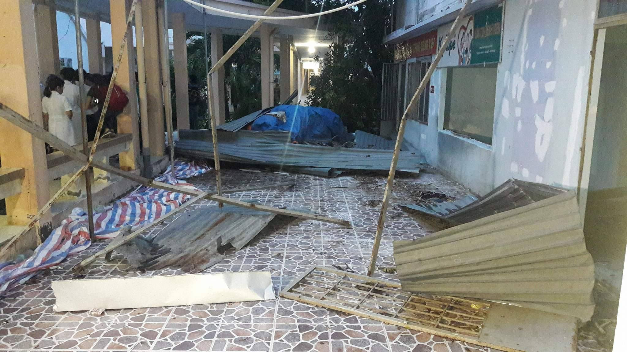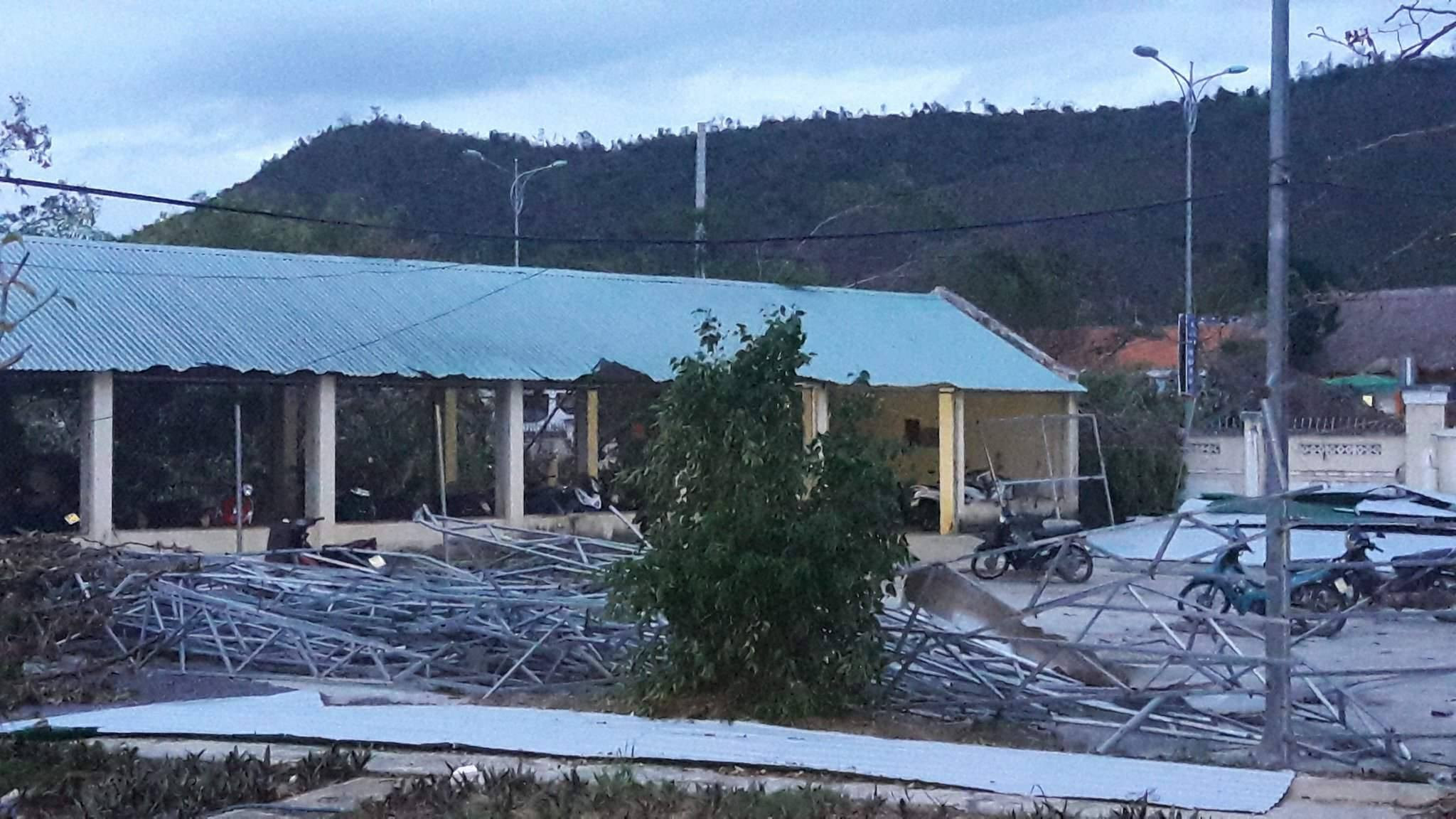 Mái và nhiều cột trên tầng 2 của trạm y tế xã Ninh Phú đã đổ vỡ, gãy do ảnh hưởng của bão số 12