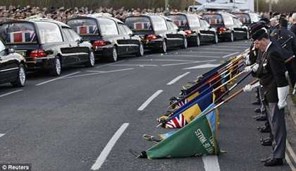 Đám tang 2 binh sĩ nhảy dù thuộc Trung đoàn kỹ thuật không quân số 17 bị bắn chết hôm 15/3 gần Toulouse