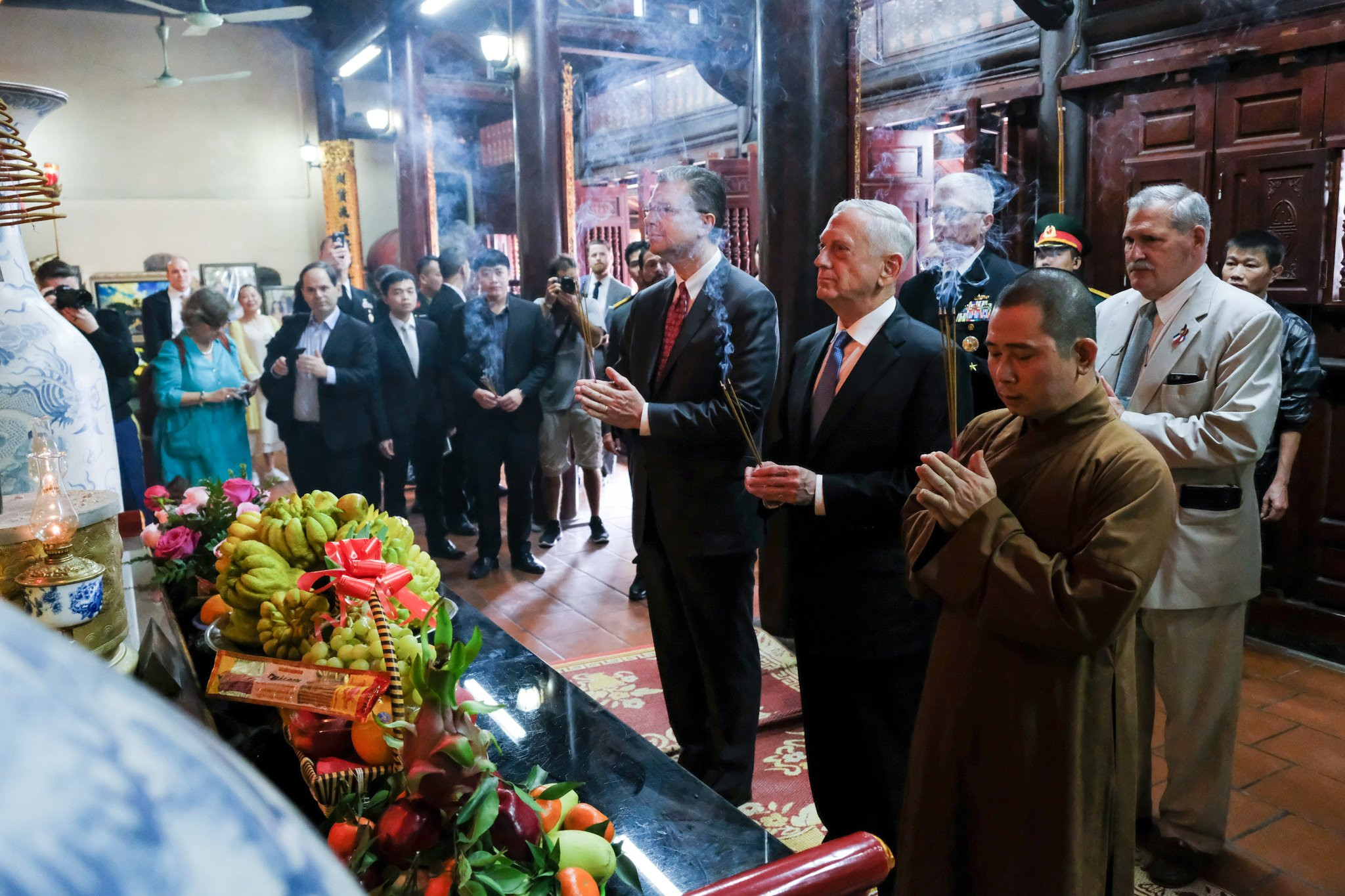 Bộ trưởng Quốc phòng Mỹ và Đại sứ Mỹ tại Việt Nam dâng hương trong Chùa Trấn Quốc. (Ảnh: Tùng Đinh)