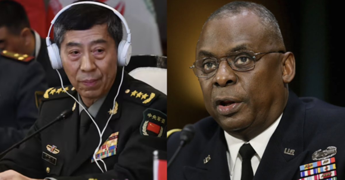 Bộ trưởng Quốc phòng Trung Quốc Lý Thượng Phúc (trái) và người đồng cấp Mỹ Lloyd Austin. (Ảnh: AFP)