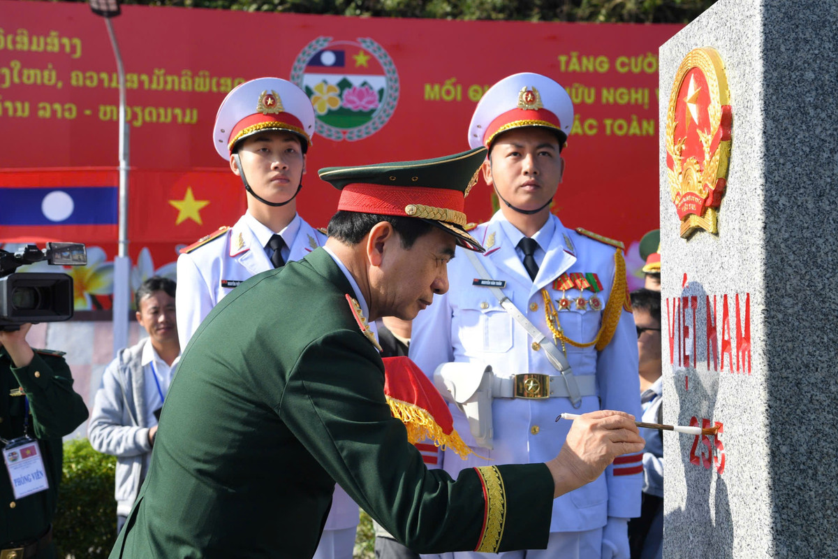 Đại tướng Phan Văn Giang và Đại tướng Chansamone Chanyalath tô son cột mốc chủ quyền số 255 giữa hai nước. (Ảnh: Trịnh Sơn)