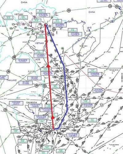 | Đường bay hiện nay (màu xanh) và đường bay thẳng theo đề xuất của ông Trần Đình Bá (màu đỏ). |
