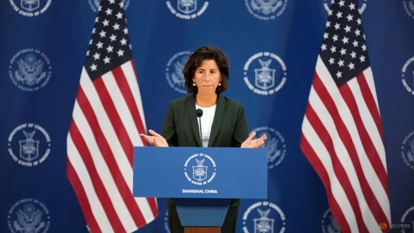 Bộ trưởng Thương mại Mỹ Gina Raimondo tham dự cuộc họp báo tại văn phòng Boeing ở Thượng Hải, Trung Quốc ngày 30/8/2023. (Ảnh: Reuters)
