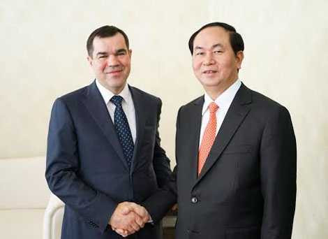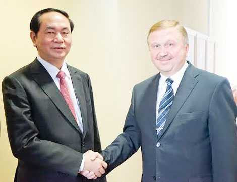 | Bộ trưởng Trần Đại Quang chào xã giao Thủ tướng Cộng hòa Belarus Andrei Kobyakov |