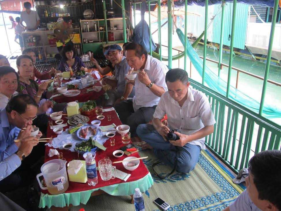 Cũng trưa nay, Phó chủ tịch UBND tỉnh Hà Tĩnh Dương Tất Thắng đã mời đoàn cán bộ Cục Vệ sinh an toàn thực phẩm, Cục Quản lý môi trường, Viện Kiểm nghiệm an toàn vệ sinh thực phẩm quốc gia (Bộ Y tế) ăn trưa bằng các món hải sản nổi tiếng ở Thiên Cầm.