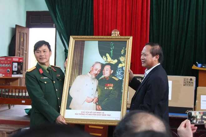 Bộ trưởng tặng Nông trường 461 (Đoàn 338) bức ảnh Bác Hồ với Đại tướng Võ Nguyên Giáp