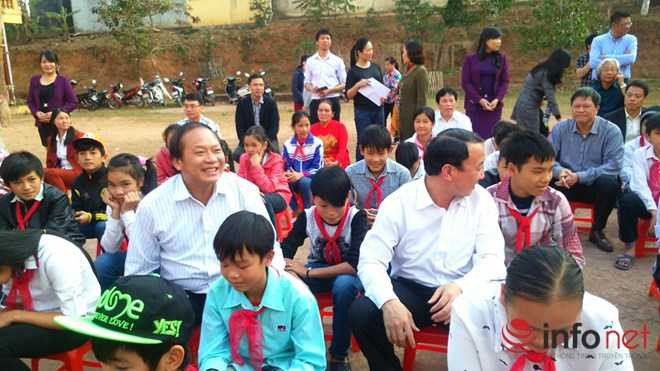 Bộ trưởng Trương Minh Tuấn không ngồi hàng ghế danh dự mà ngồi cùng trẻ em dân tộc bán trú trong cuộc gặp với thầy trò nhà trường.