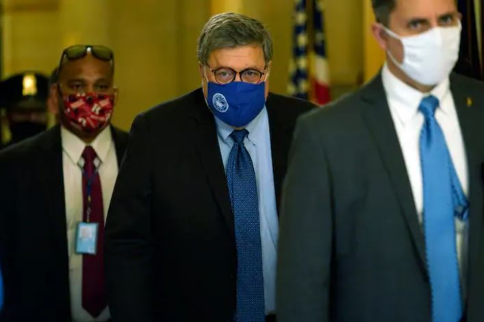 Ông William Barr (giữa) rời Tòa nhà quốc hội Mỹ hôm thứ Hai (9/11). (Ảnh:AP)