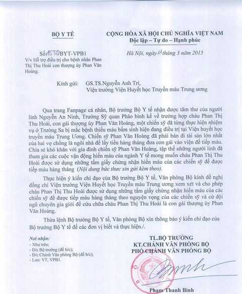 Bộ trưởng Bộ Y tế Nguyễn Thị Kim Tiến đã chỉ đạo Viện trưởng Viện Huyết học và Truyền máu Trung ương xem xét, chấp thuận kiến nghị của những người hiến máu và cử đội ngũ chuyên gia giỏi để cứu chữa cho cháu Phan Thị Thu Hoài. Ngày 12/3, Văn phòng Bộ Y tế đã có công văn gửi Viện Huyết học và Truyền máu Trung ương truyền đạt chỉ đạo trên.