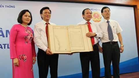 | Thứ trưởng Bộ TT&TT Trương Minh Tuấn và Thứ trưởng Bộ Nội vụ Nguyễn Duy Thăng đánh giá cao tầm quan trọng của Bộ Atlas trong công tác tuyên truyền bảo vệ chủ quyền biển, đảo Việt Nam |