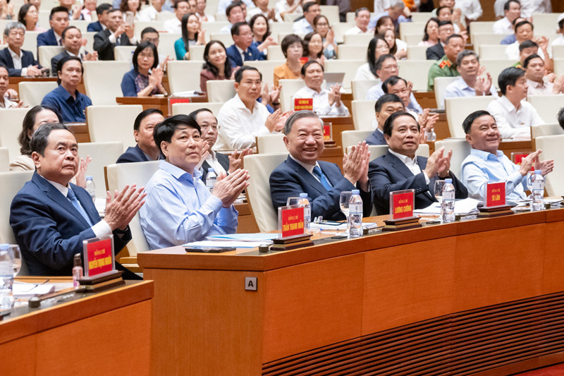 Các lãnh đạo Đảng, Nhà nước và đại biểu tham dự Hội nghị toàn quốc quán triệt, triển khai thực hiện Nghị quyết số 66 và Nghị quyết số 68 của Bộ Chính trị. (Ảnh: Phạm Thắng)
