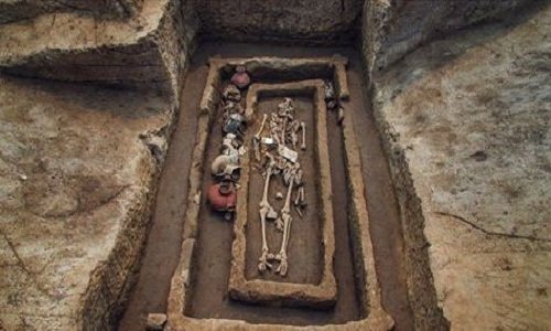 Một bộ hài cốt khai quật ở di chỉ Tiêu Gia. (Ảnh: Xinhua)
