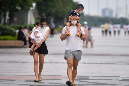 Một gia đình ở TP.HCM đưa con đến phố đi bộ Nguyễn Huệ đi dạo khi thành phố mở cửa. )Ảnh: Duy Hiệu)