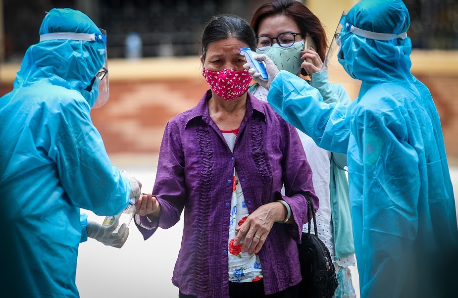Nhân viên y tế đo thân nhiệt cho người dân ở Hà Nội.