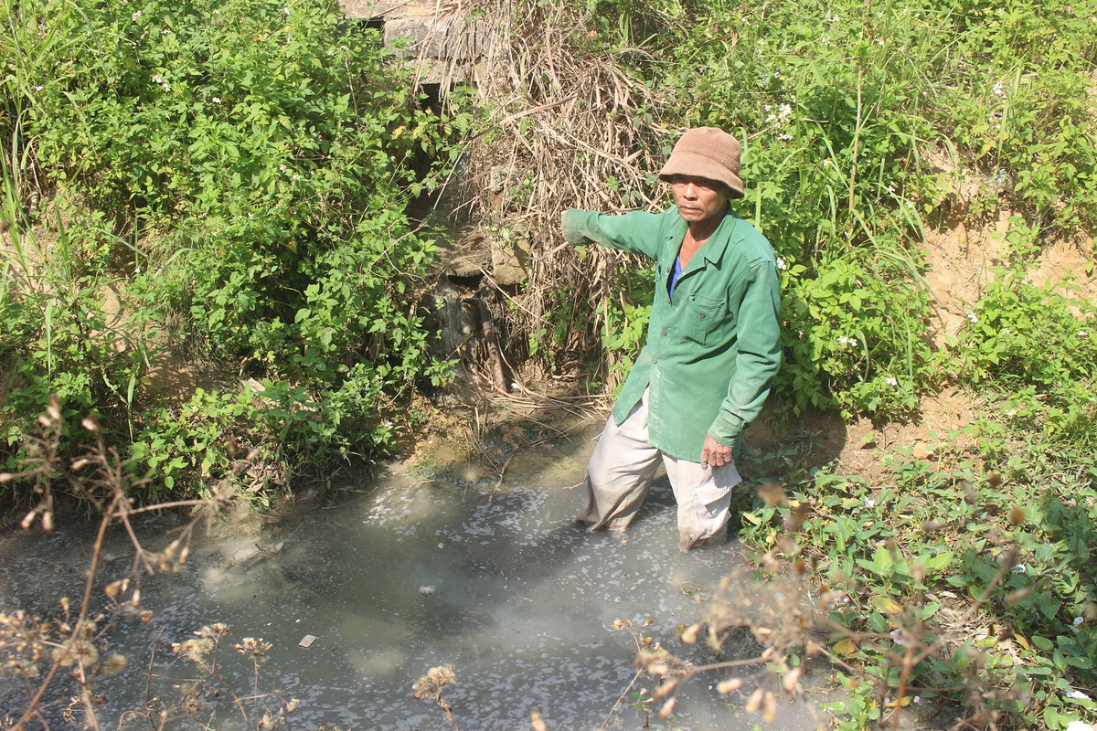 Dẫn phóng viên ra con mương phía sau nhà, ông Đinh Quang Trọng (55 tuổi) khẳng định, nguồn nước đục ngầu kèm bọt trắng và bốc mùi thối dưới mương là do Nhà máy Tinh bột mì Quảng Ngãi thải ra.