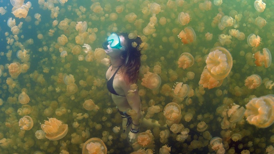 Khi bạn bơi ở hồ Jellyfish tại Cộng hòa Palau, những con sứa vàng bắt đầu nhô lên xung quanh, chen chúc nhau ngày càng nhiều và khiến bạn choáng ngợp.