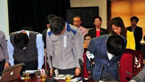 | Đại diện công ty Formosa và nhà thầu Samsung cúi đầu tạ lỗi. |