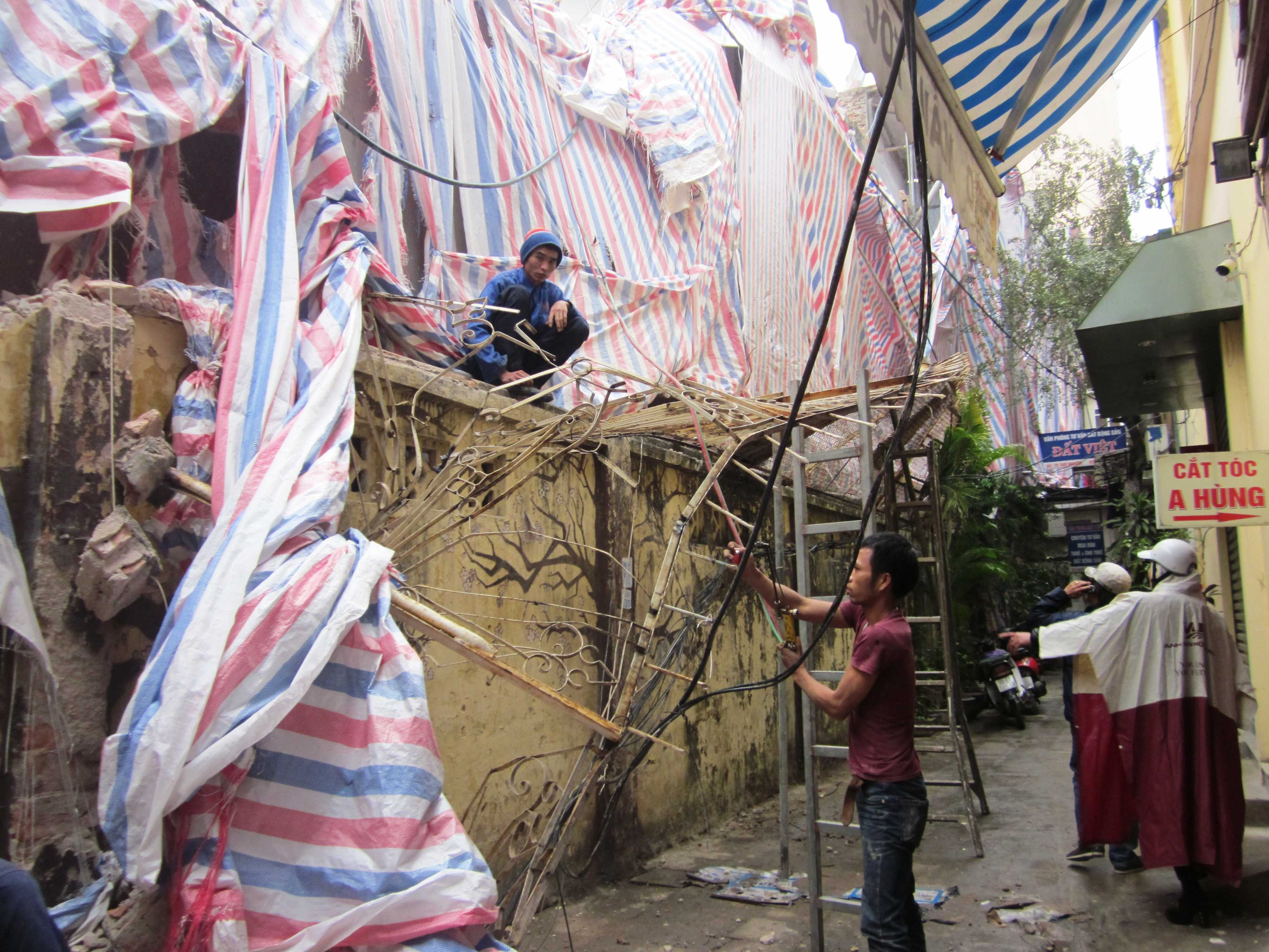 Chưa hết bàng hoàng về sự việc, ông Đặng Tất Cường (trú ở ngõ 76 Thợ Nhuộm) cho biết, khi ông đang ngồi ở trong nhà thì giật mình bởi một tiếng động lớn, ngay sau đó là tiếng kêu của người dân xung quanh, lúc đi ra thì đã thấy bê tông của công trình bên cạnh rơi xuống ngõ.
