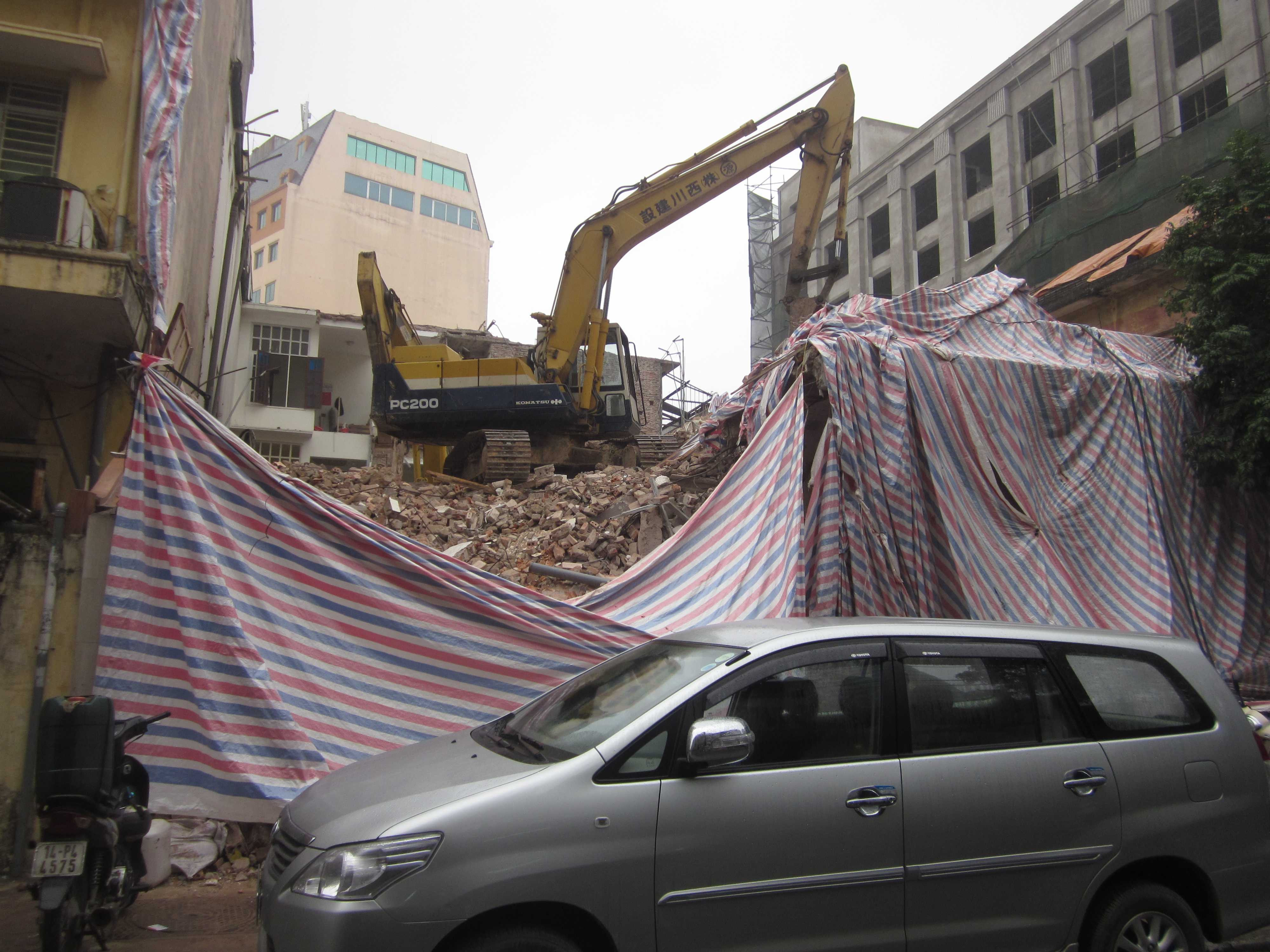 Tại công trình xây dựng số 78 Thợ Nhuộm có một chiếc máy xúc đang thực hiện việc phá dỡ bê tông, công trình xây dựng chỉ được bọc xung quanh bằng bạt mà không có biện pháp đảm bảo an toàn nào khác.