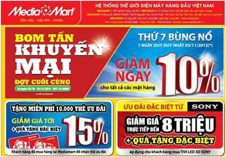 Với hệ thống Thế giới điện máy Media Mart, đợt cuối Bom tấn khuyến mại kéo dài từ 26/10/-1/11 có sức công phá lớn tung ra ngay cuối tháng 10 được xem là điểm nhấn nhiều bất ngờ trong thời điểm người tiêu dùng thủ đô đang đón đợi tháng Khuyến mại Hà Nội 2012.