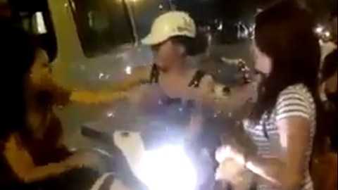 Hai cô gái đang chạy xe SH trên đường, thì hai cô gái khác đi Vespa phía sau rồi chen vào trong, phía bên phải, sau đó cả 4 lời qua tiếng lại, rồi dừng xe đánh nhau giữa đường.