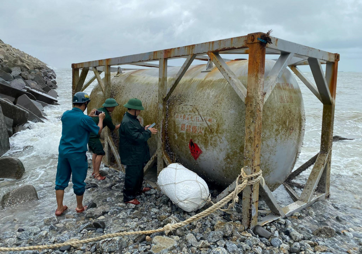 Cách đây không lâu, Bộ Chỉ huy Bộ đội Biên phòng Quảng Nam cũng xử lý bồn hóa chất trôi dạt vào bờ biển địa phương.