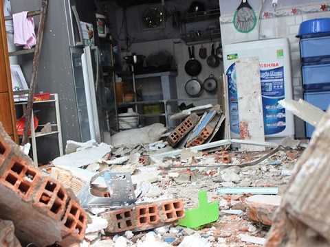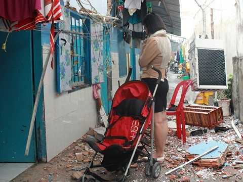 Khi chúng tôi trở lại dãy trọ trên, căn phòng trọ của vợ chồng chị Ly (33 tuổi, mẹ bé gái) vẫn còn tan hoang chưa được dọn dẹp. Bê tông đổ nát khắp nhà, tấm nệm và trên tường vẫn còn sót lại những vết máu.