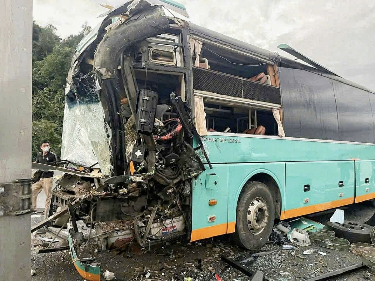 Vụ tai nạn liên hoàn khiến phần đầu xe khách vỡ vụn. ( Ảnh Công an cung cấp)