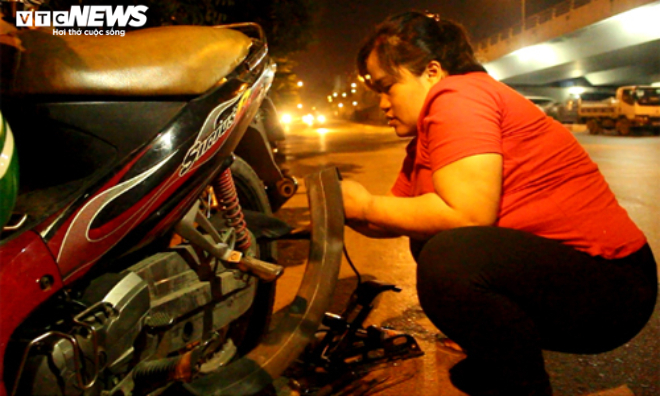 Chị Hằng - một trong 7 thành viên của đội Cứu hộ xe máy đang sửa xe cho khách ở quận Cầu Giấy (TP Hà Nội).