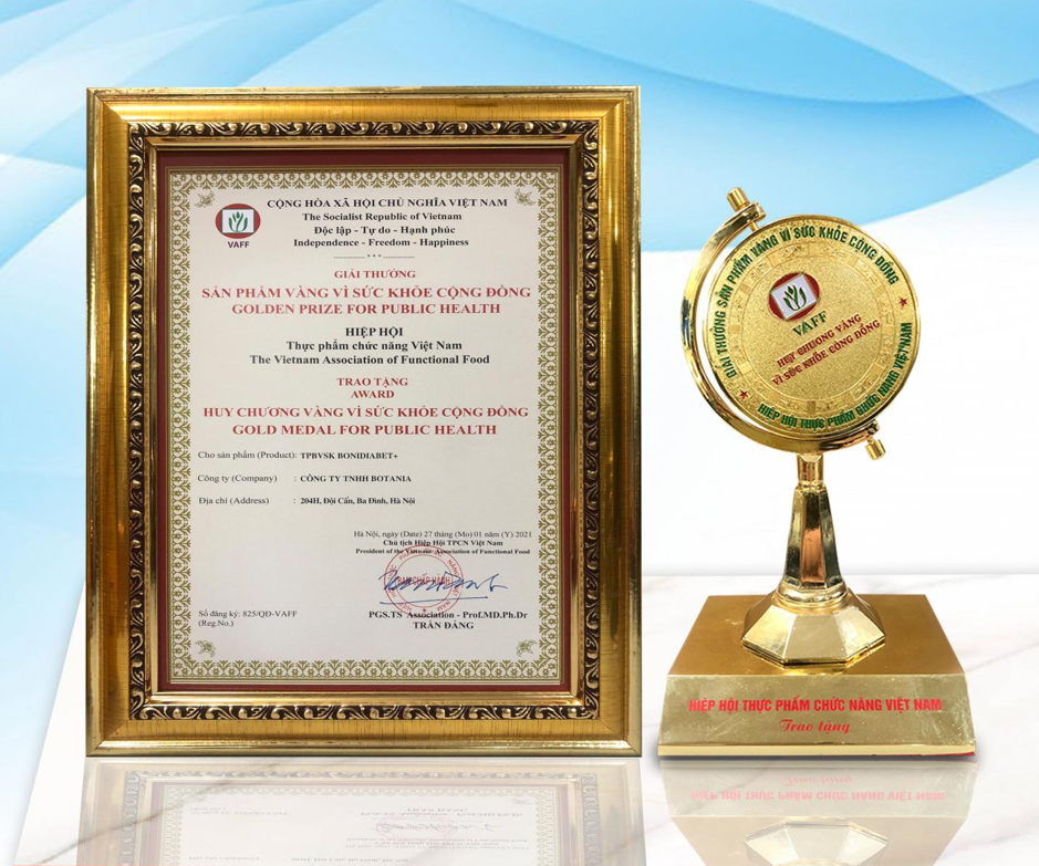 BoniDiabet + là sản phẩm duy nhất dành cho bệnh nhân tiểu đường được vinh danh tới 4 lần tại lễ trao giải “Sản phẩm vàng vì sức khỏe cộng đồng” do Hiệp hội thực phẩm chức năng trao tặng vào các năm 2014, 2017, 2019 và 2021.