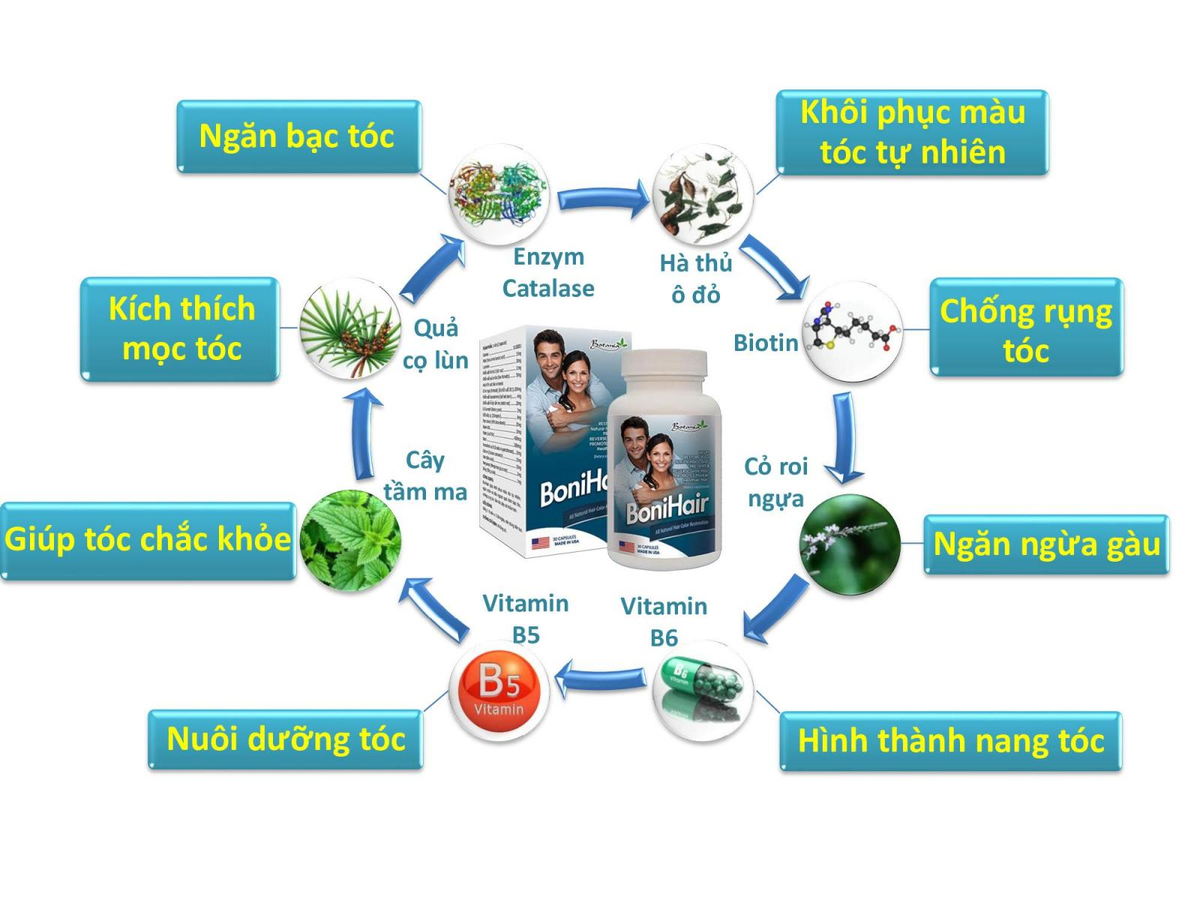 BoniHair có thành phần chính là enzyme Catalase - một enzyme chống oxy hóa mạnh, một phân tử Catalase có thể phân hủy hàng triệu phân tử H2O2, từ đó giúp làm chậm, làm ngừng quá trình bạc tóc, khôi phục màu sắc tự nhiên cho mái tóc.