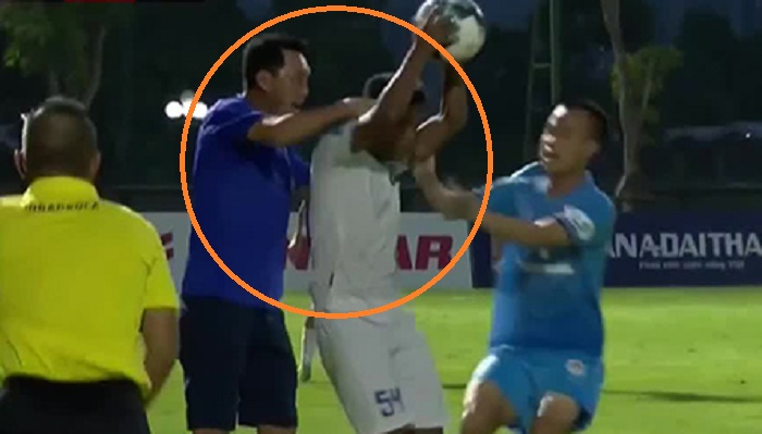Trong trận đấu tối 7/7 gặp An Giang, vị HLV trưởng của CLB Phố Hiến nổi nóng lao ra đường biên bóp cổ cầu thủ Văn Huy của đối phương.