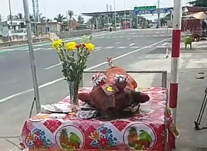 Tài xế đem heo quay đến cúng tại trạm thu phí Cai Lậy.
