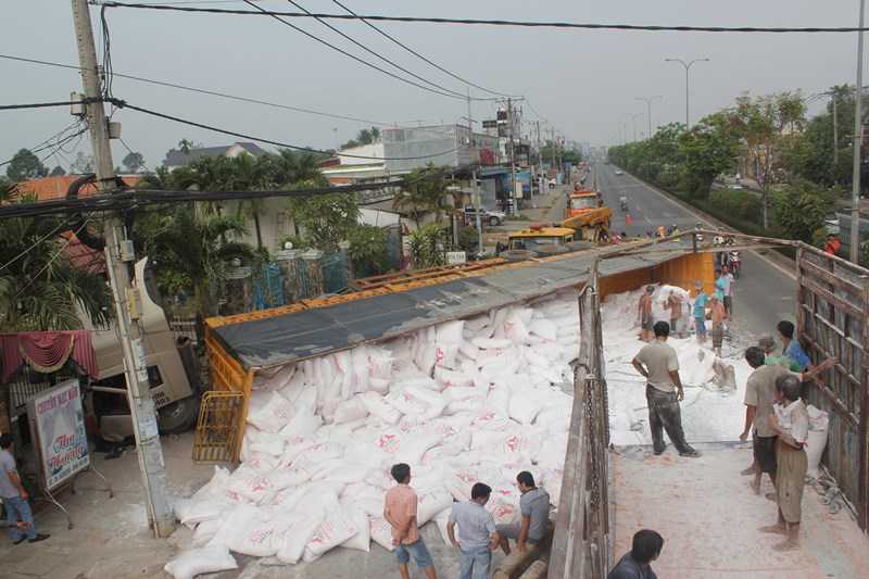 Chiếc xe container chở bột mì lật ngang trên quốc lộ, hàng chục bao mì tràn xuống đường