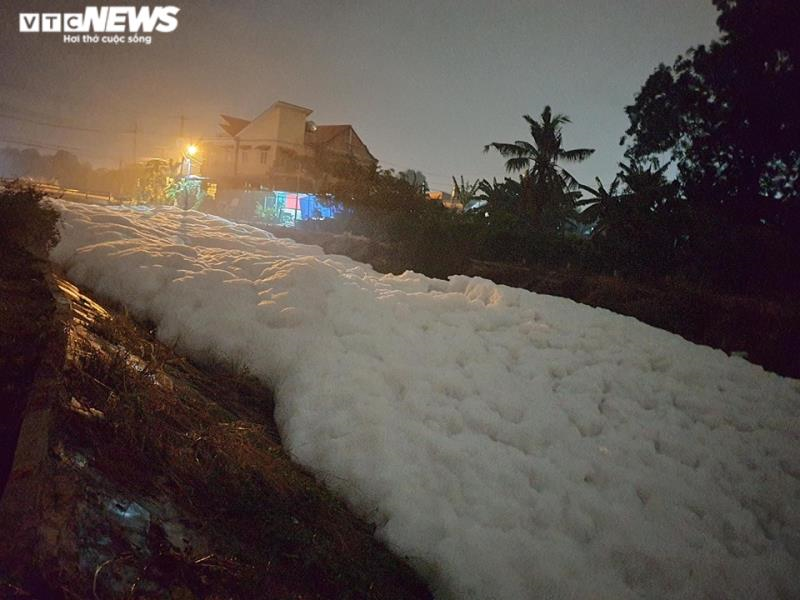 Bọt trắng dày nổi kín một đoạn kênh.