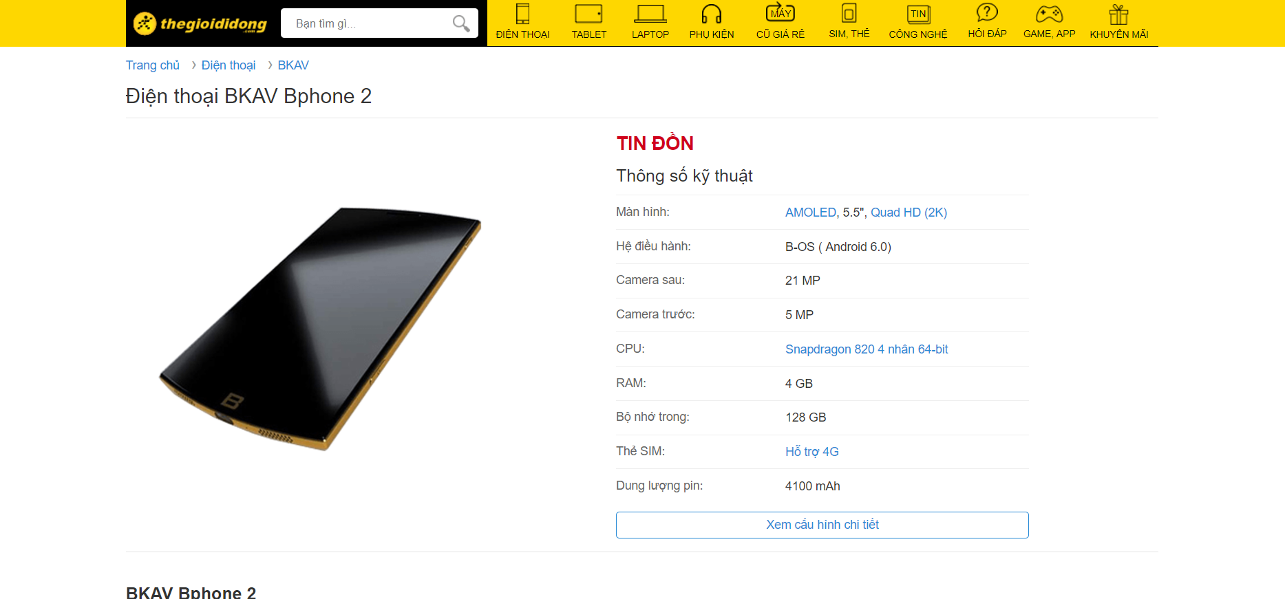 Trên trang chủ của Thế giới Di dộng đang "trưng bày" tin đồn về sản phẩm "số 1 Việt Nam" Bphone thế hệ thứ 2.