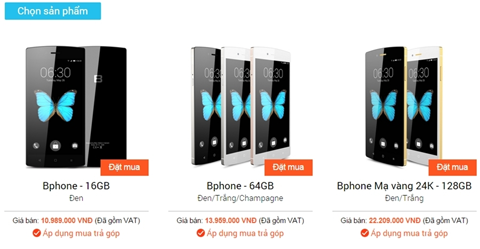 | Hiện tại, giá Bphone chính hãng bản 16 GB, 64 GB và 128 GB (mạ vàng) lần lượt là 8 triệu đồng, 11 triệu đồng và 19,2 triệu đồng, trong khi giá bán thời điểm vừa ra mắt cao hơn 3 triệu đồng với từng phiên bản. |