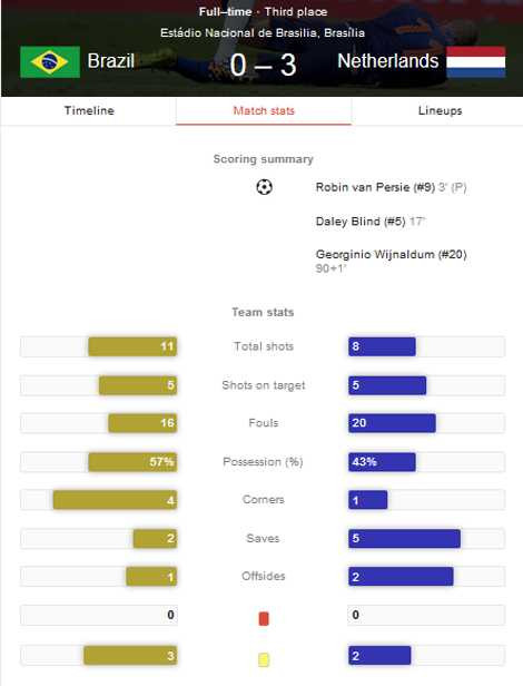 90': VÀO...VÀO... VÀO... Tỷ số là 3-0 cho Hà Lan, kết thúc mọi nỗ lực của Brazil. Người ghi bàn là Wijnaldu với một pha kết thúc gọn gàng sau đường căng ngang như đặt của Robben bên cánh phải.