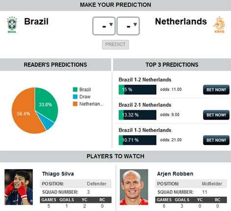 2': PENALTY. Ngay ở đầu trận đấu, Van Persie và Robben đã có pha phối hợp cực hay để xé toang hàng thủ Brazil khiến đội trưởng Thiago Sival vừa trở lại sau án treo giò, buộc phải phạm lỗi lộ liễu. Tuy nhiên, ý đồ kéo người ngoài vòng cấm không thành khi Robben đủ thông minh, kinh nghiệm để chỉ có thể ngã trong vòng cấm.